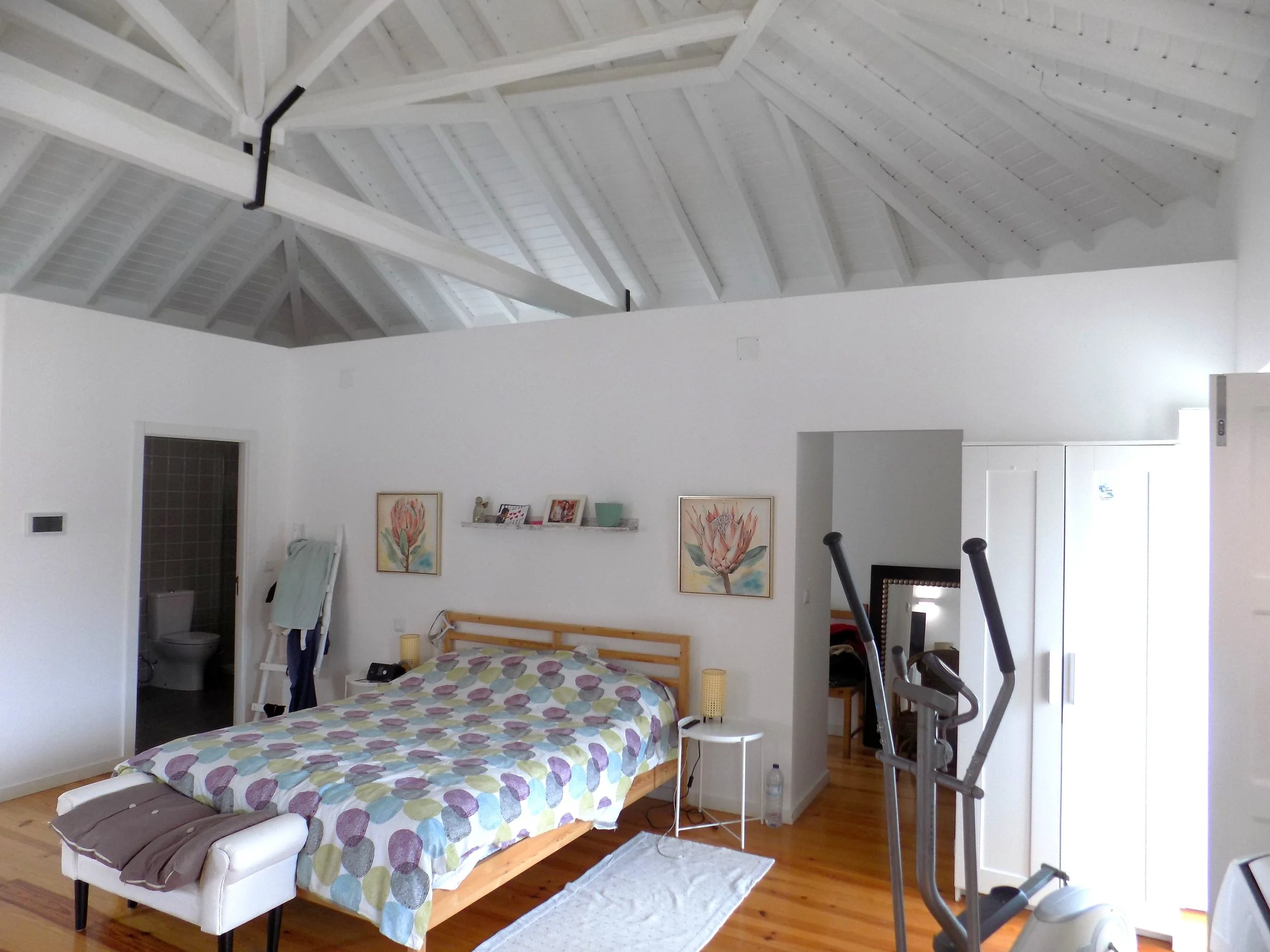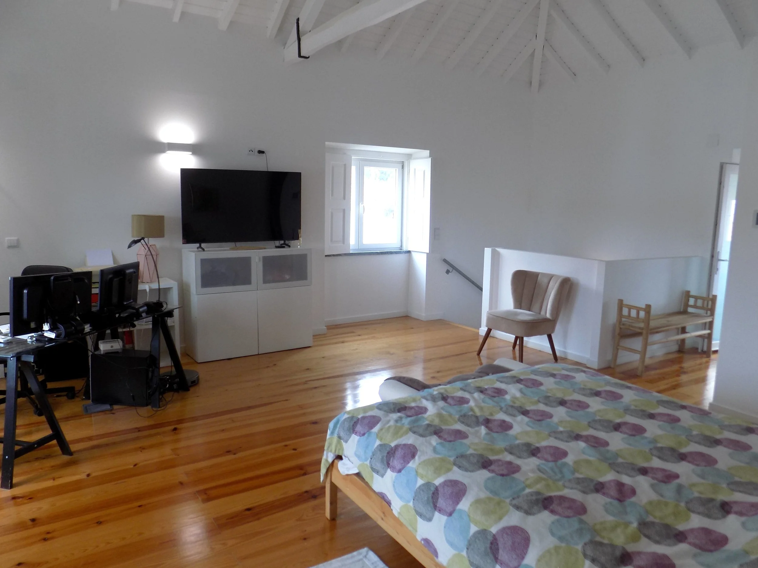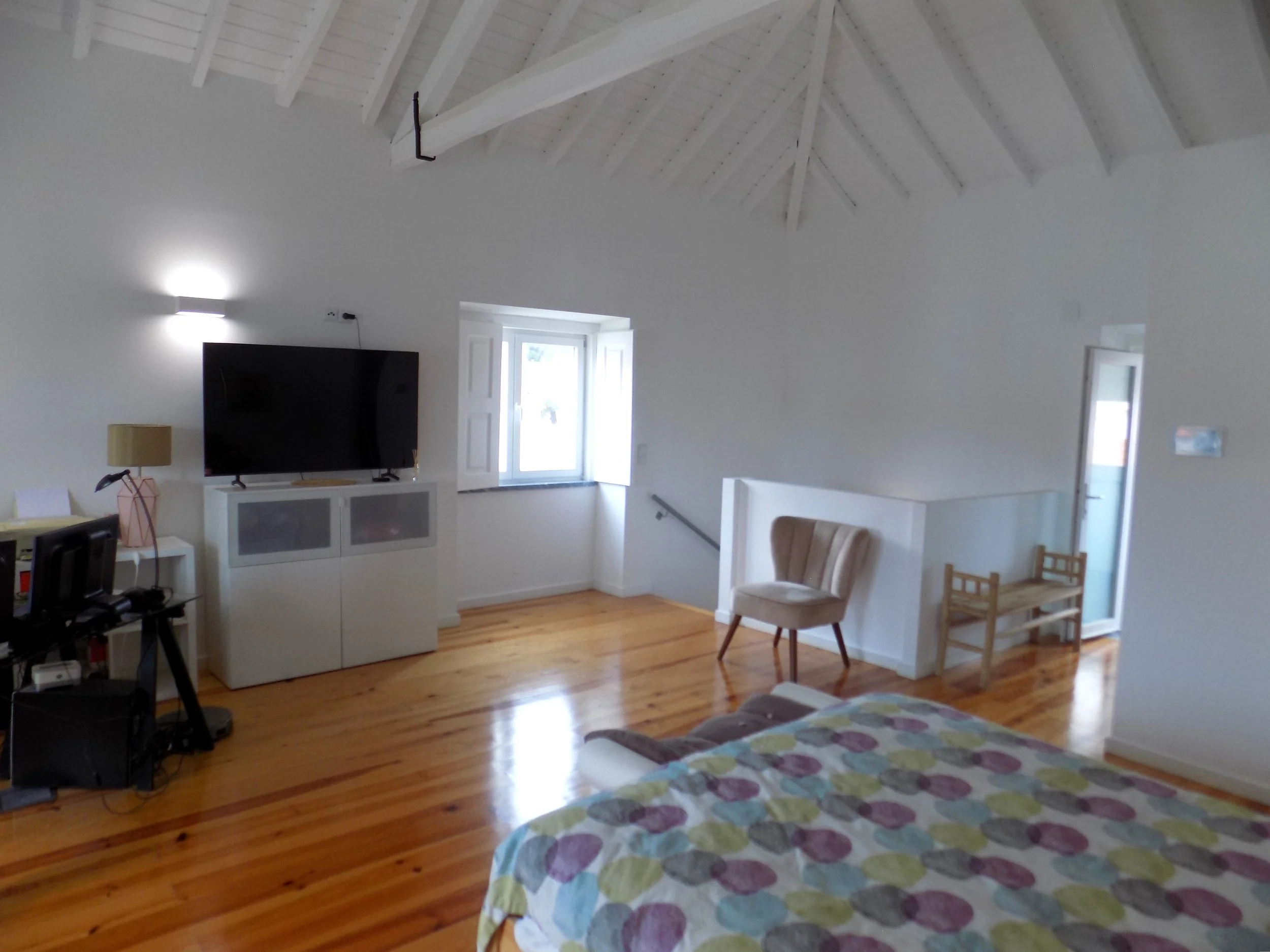 No andar superior temos uma suite com tetos altos com madeira aparente, uma zona de vestir, uma kitchenette e ainda um espaço extra que pode ser usado como escritório.