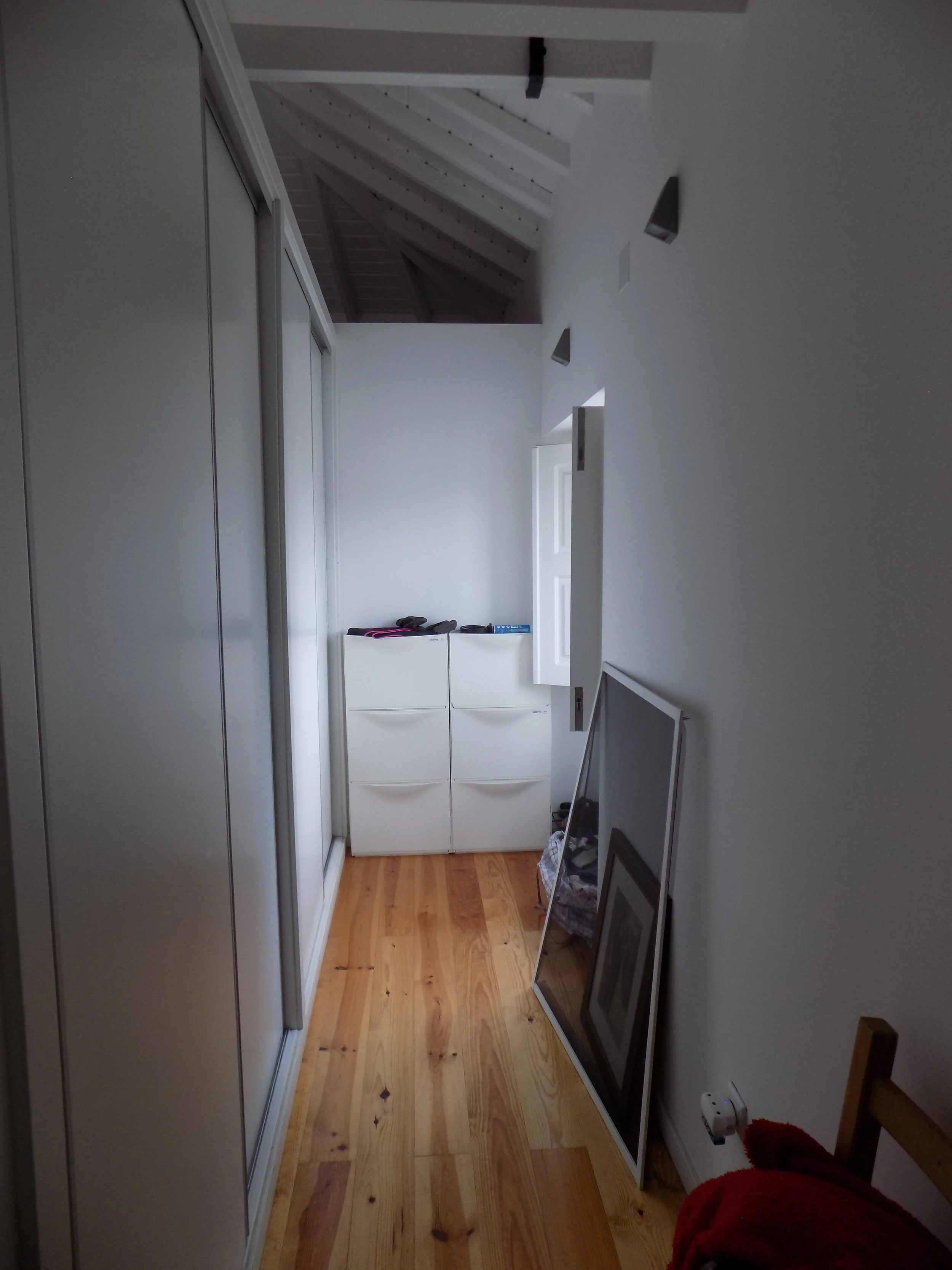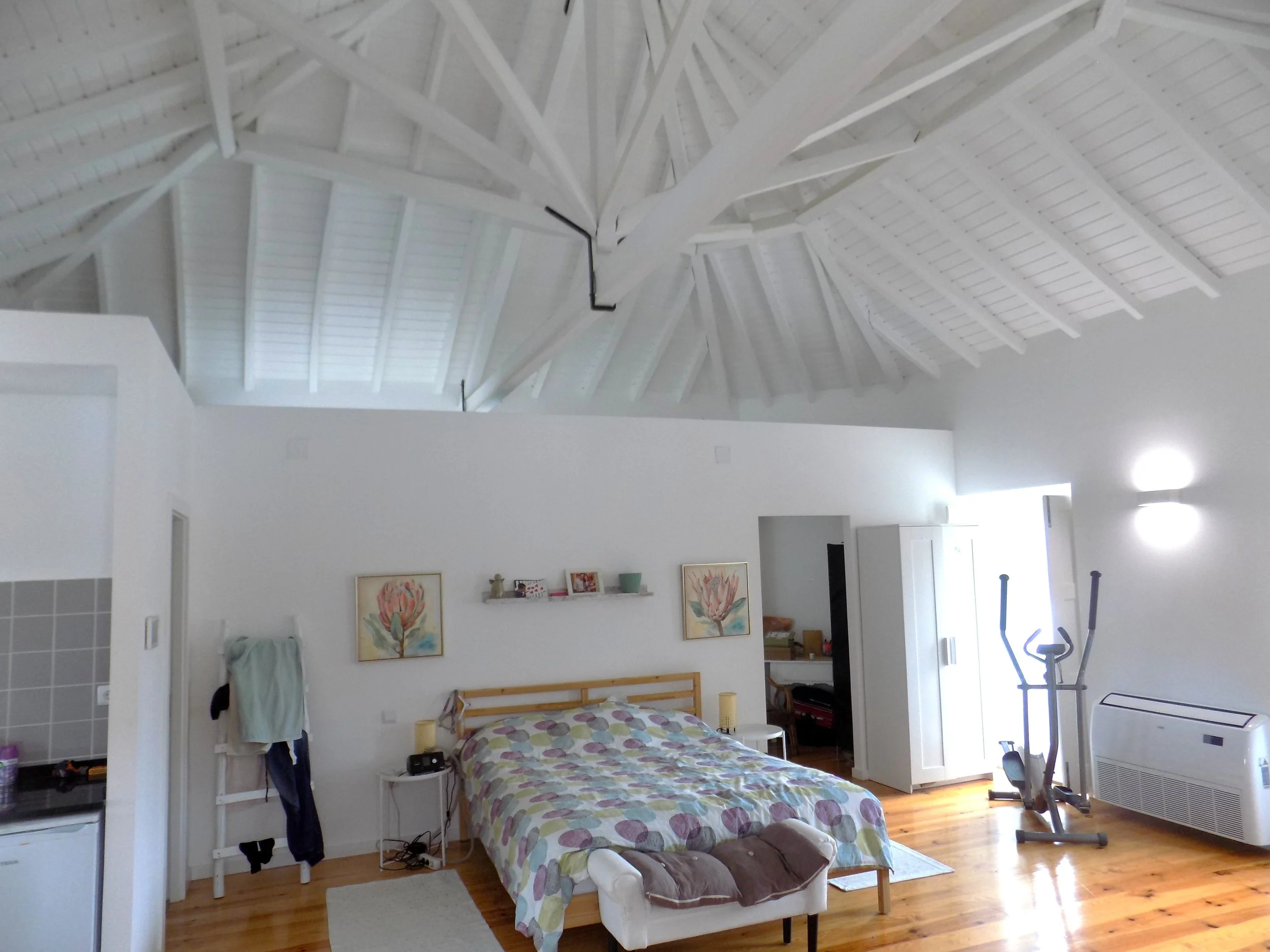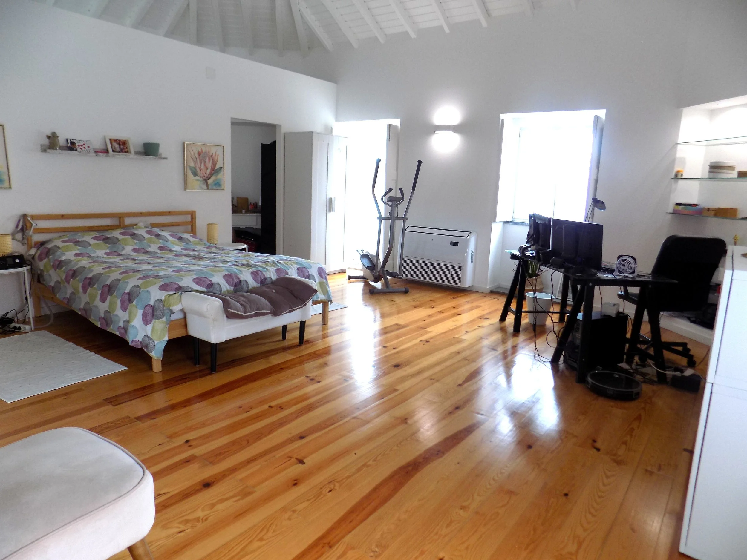 No andar superior temos uma suite com tetos altos com madeira aparente, uma zona de vestir, uma kitchenette e ainda um espaço extra que pode ser usado como escritório.