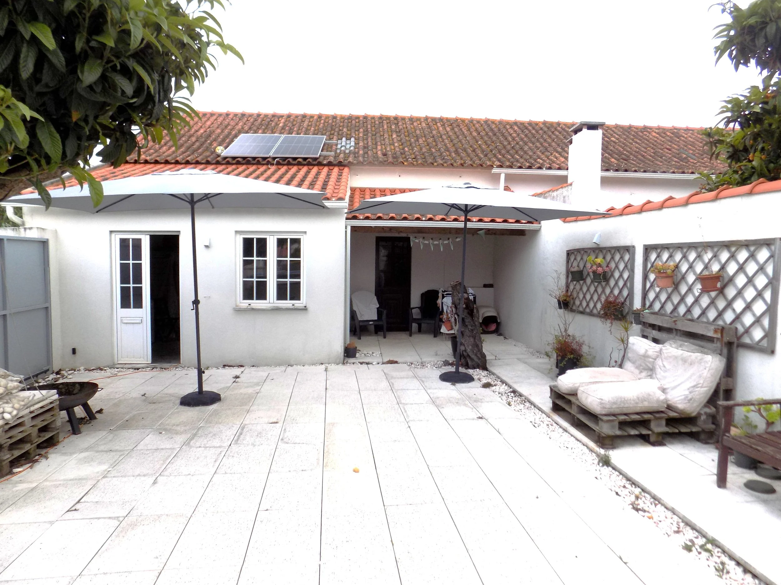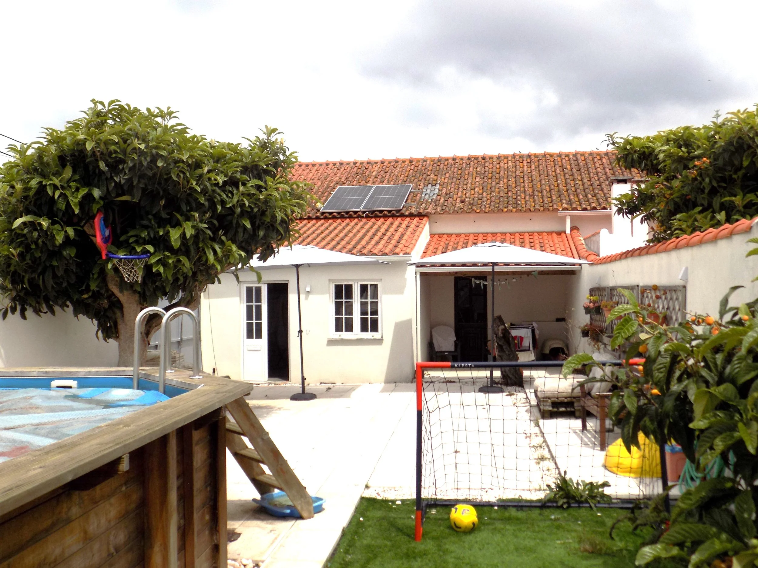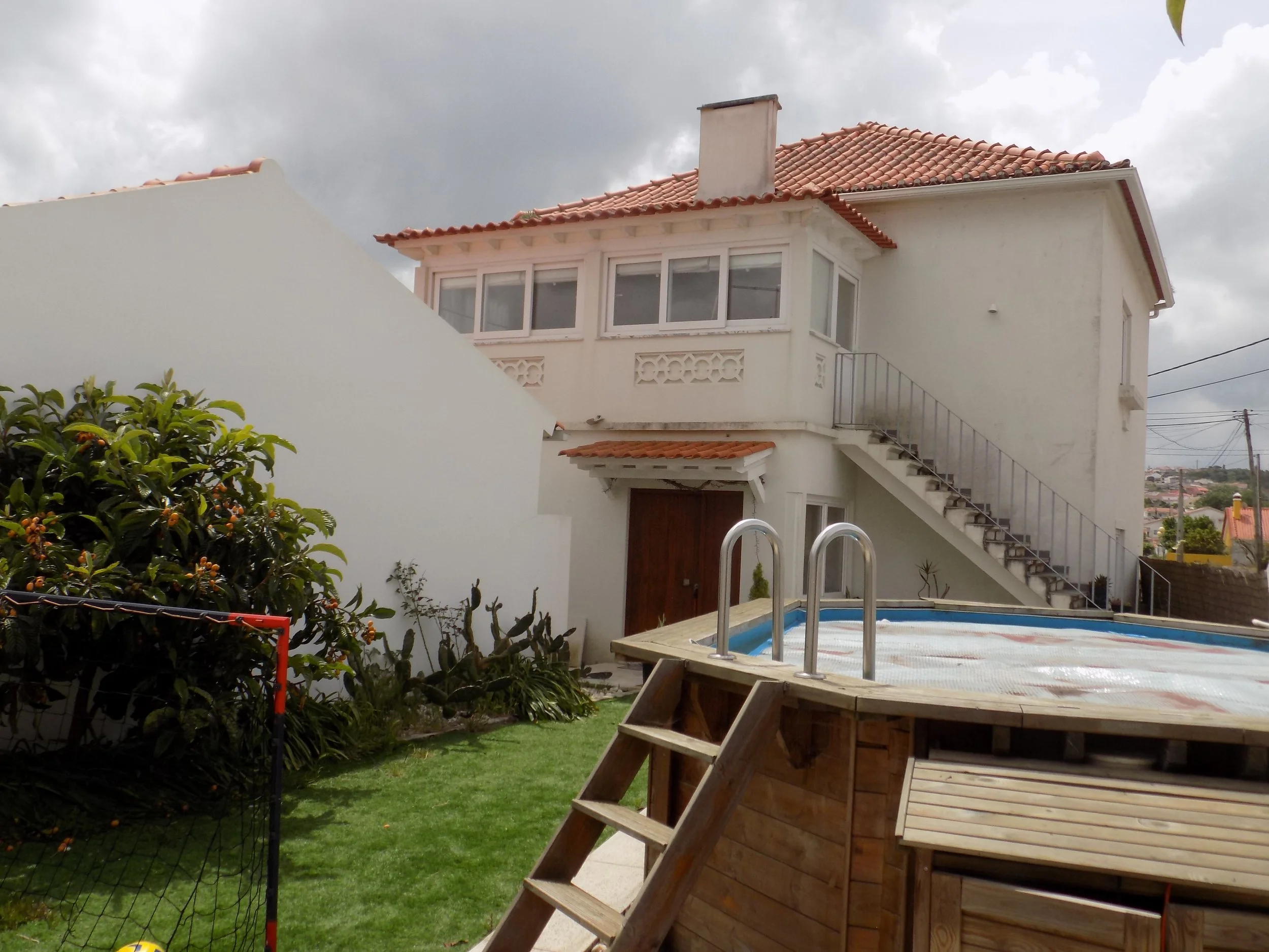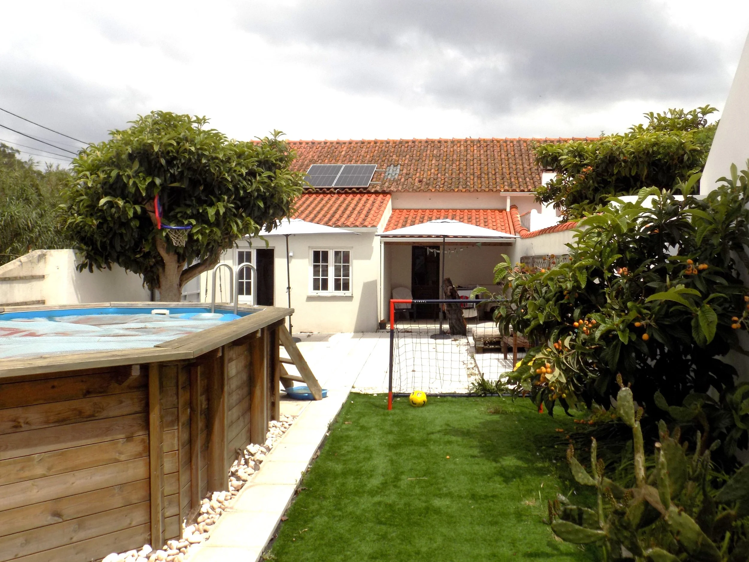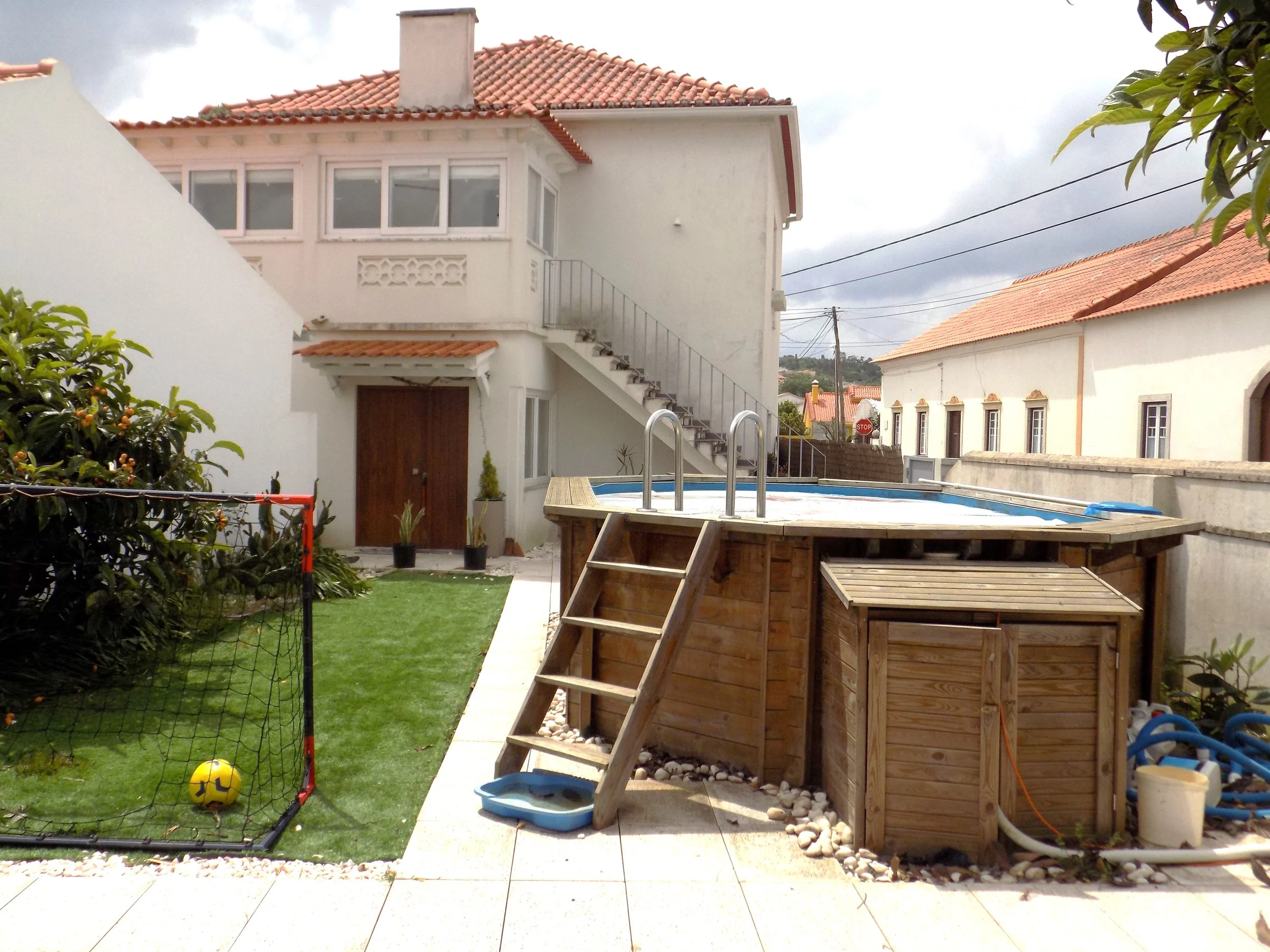 Há um pátio soalheiro onde atualmente existe uma piscina elevada e uma zona de lazer.