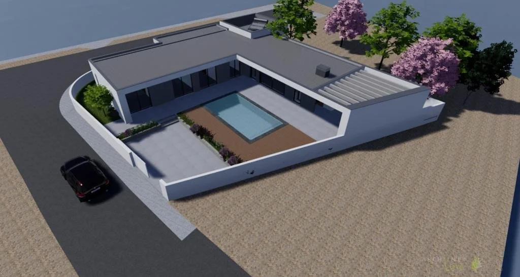 Moradia contemporânea de piso térreo, 4 quartos, 4 casas de banho, sala e cozinha openspace. Acesso a garagem e todos os quartos com roupeiros e acesso a piscina.