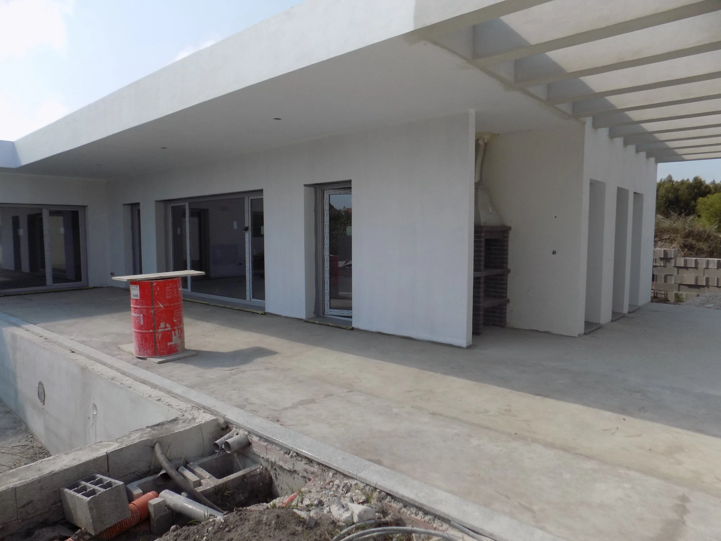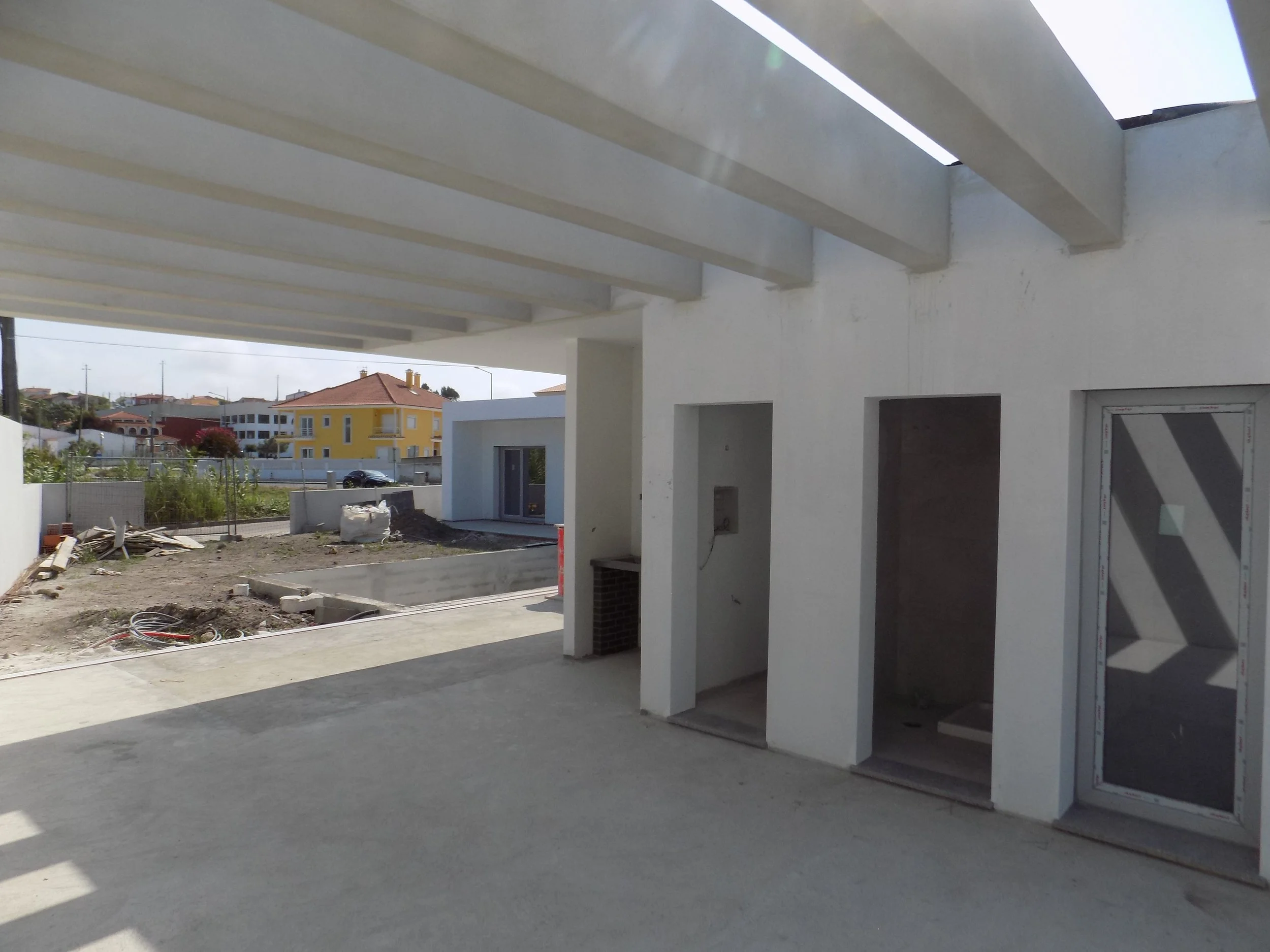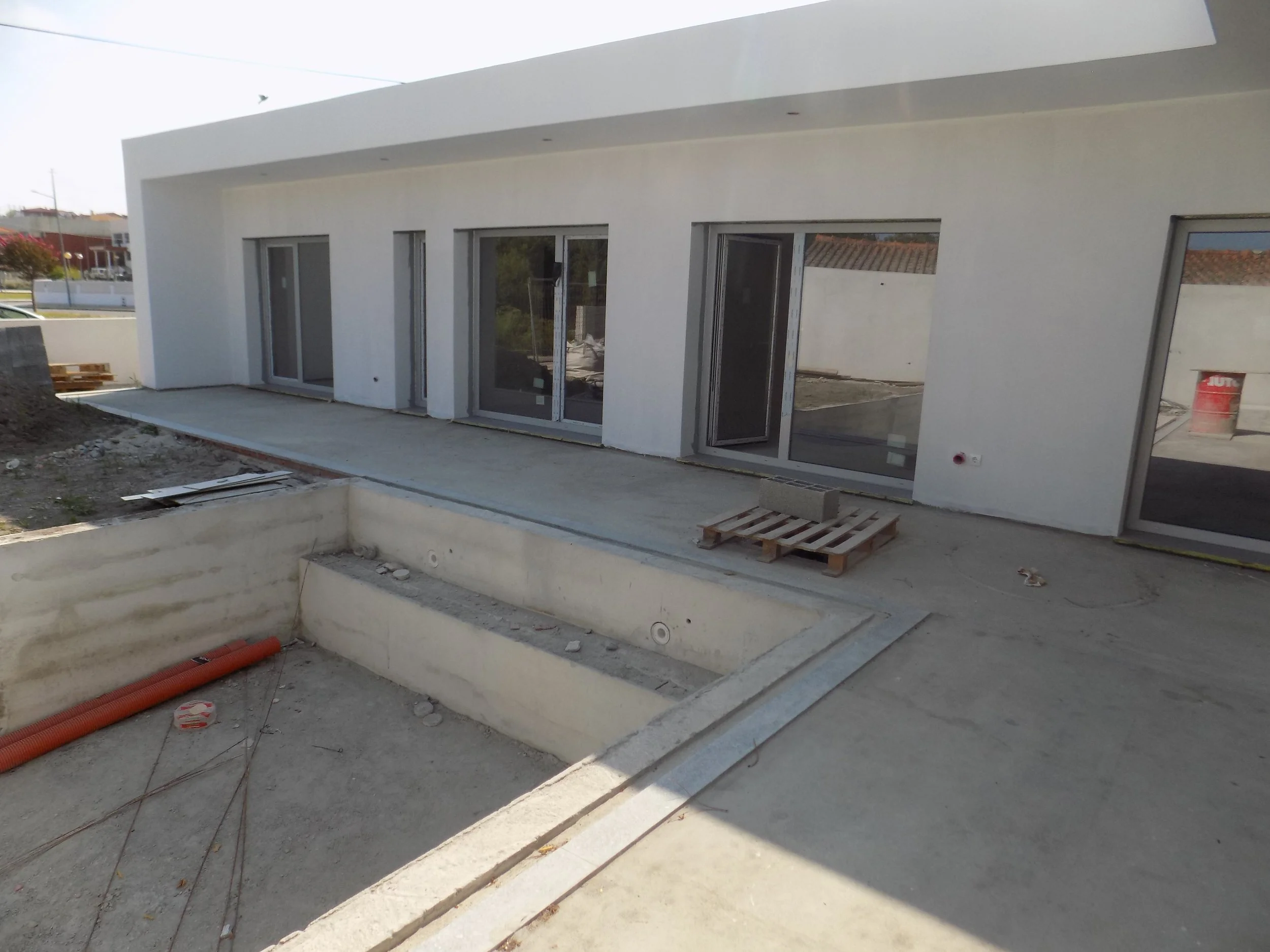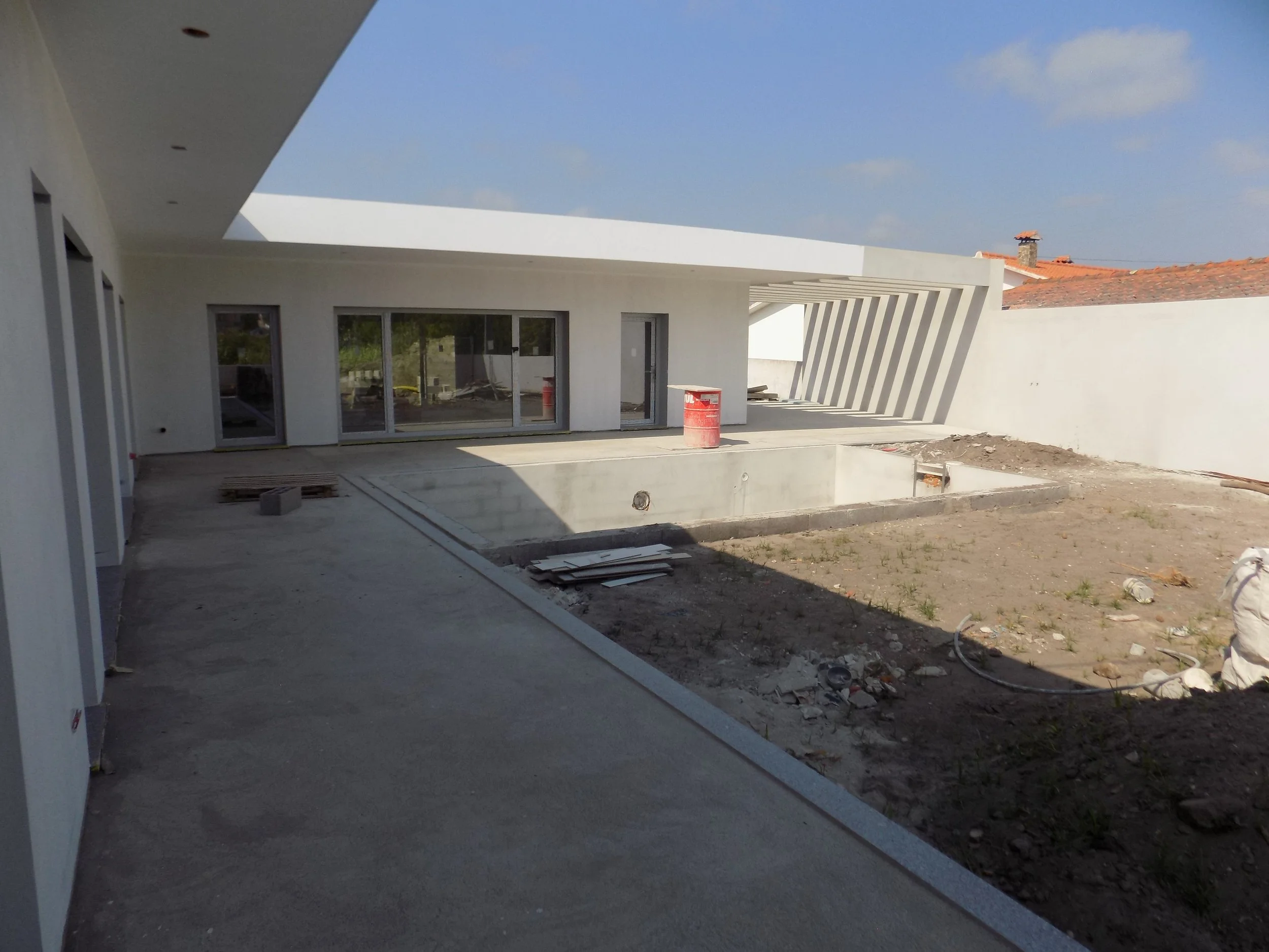 Pátio, zonas ajardinadas, telheiro com churrasqueira, piscina com 7,00 x 4,00, deck, painéis fotovoltaicos, bomba de calor para aquecimento de águas.